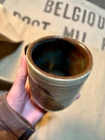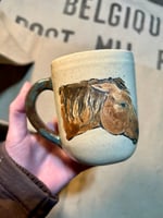 This mug may be slightly textured in some spots. The interior and handle glaze is brown with bits of turquoise, exterior has a clear glaze except on the horse head. Colors may appear slightly different in person.