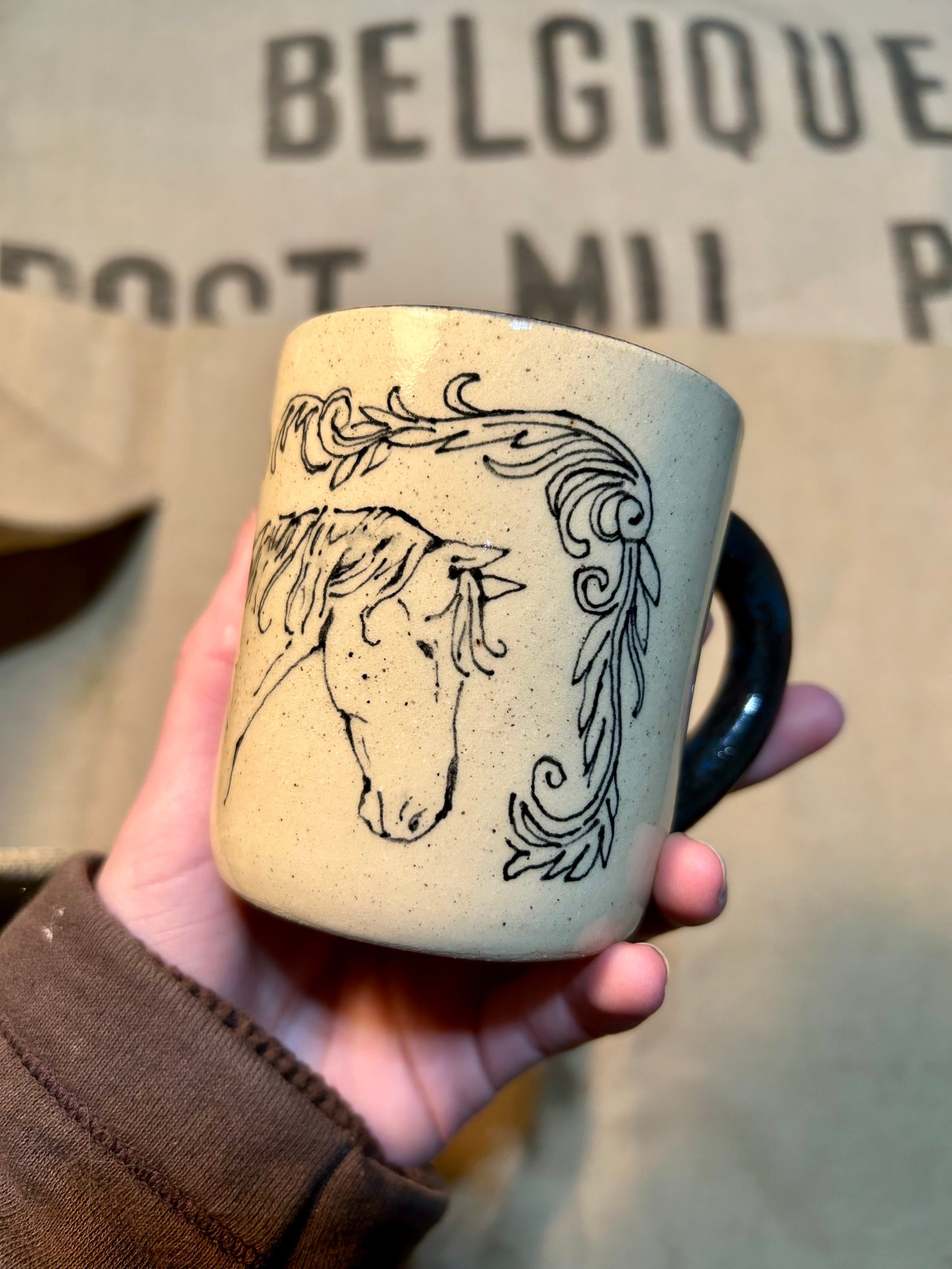 Handmade ceramic mug with a hand drawn horse and filigree.