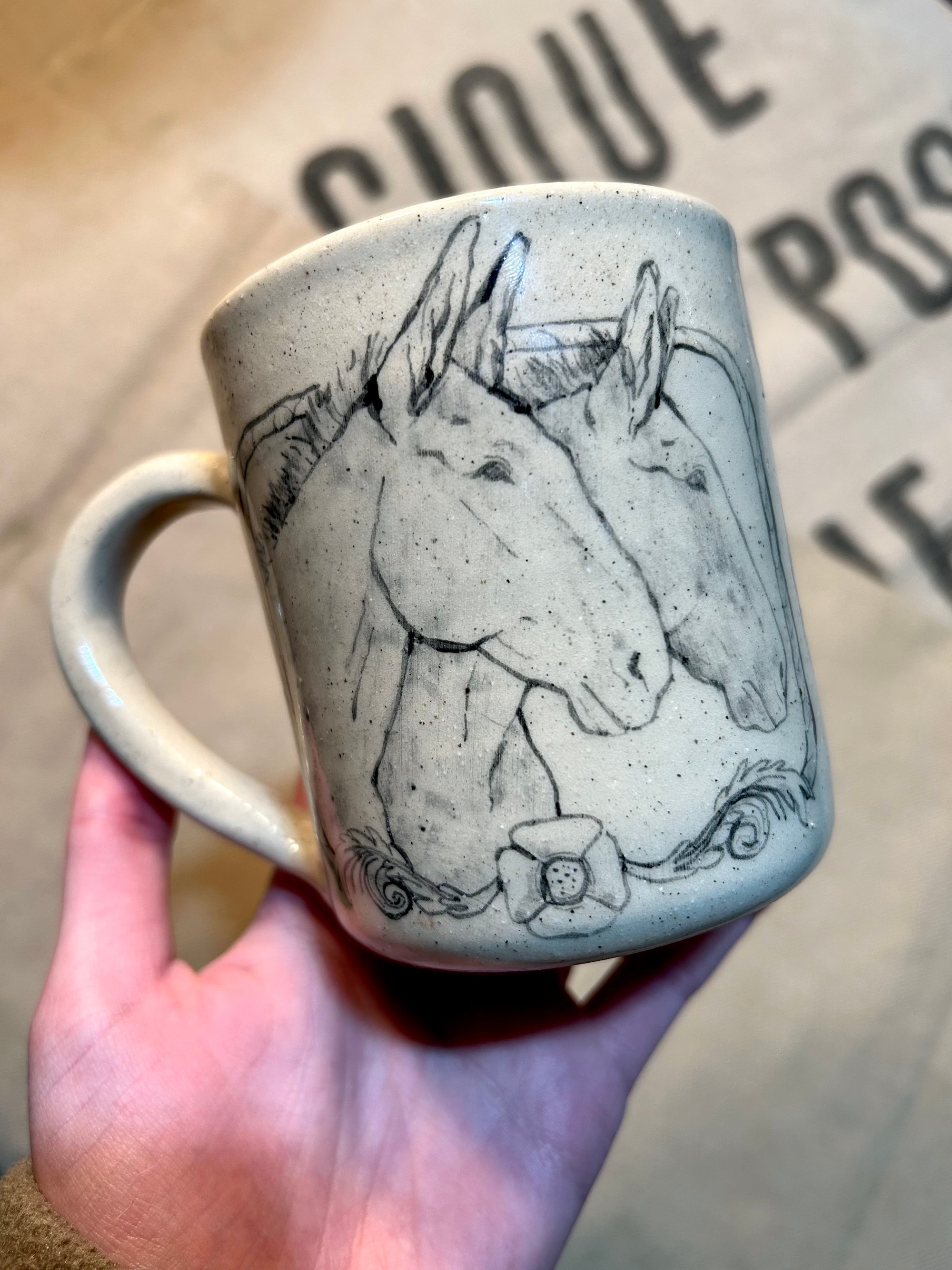 Handmade ceramic mug with a hand-drawn pair of draft mules. The interior glaze is a reddish brown with variation of turquoise.