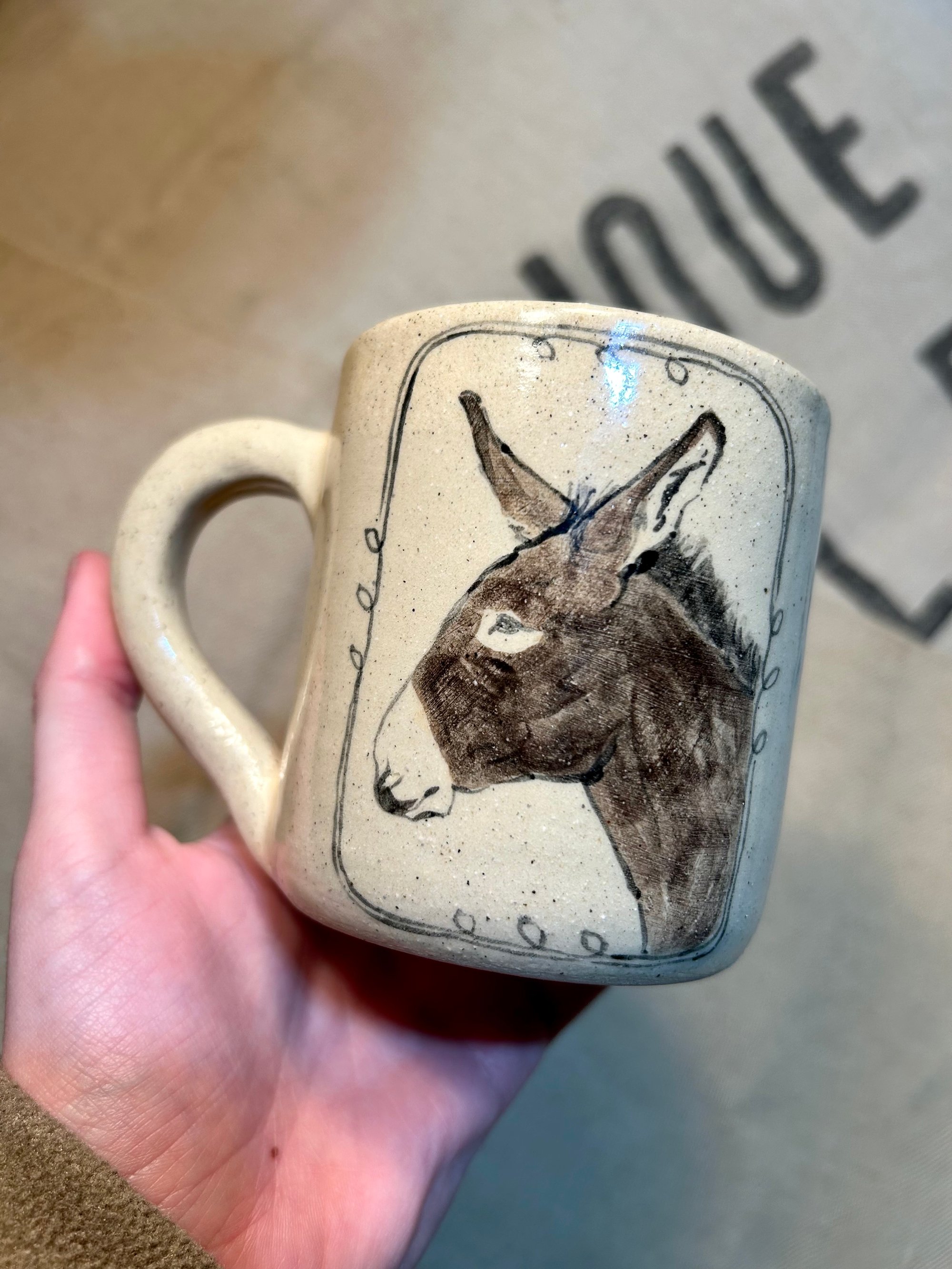 This mug is part of the “flawed pottery” due to its glazing flaws. The donkey itself wasn’t painted correctly, and there is also some errant glazing on the backside and handle (can be seen in third photo). It is still fully functional!