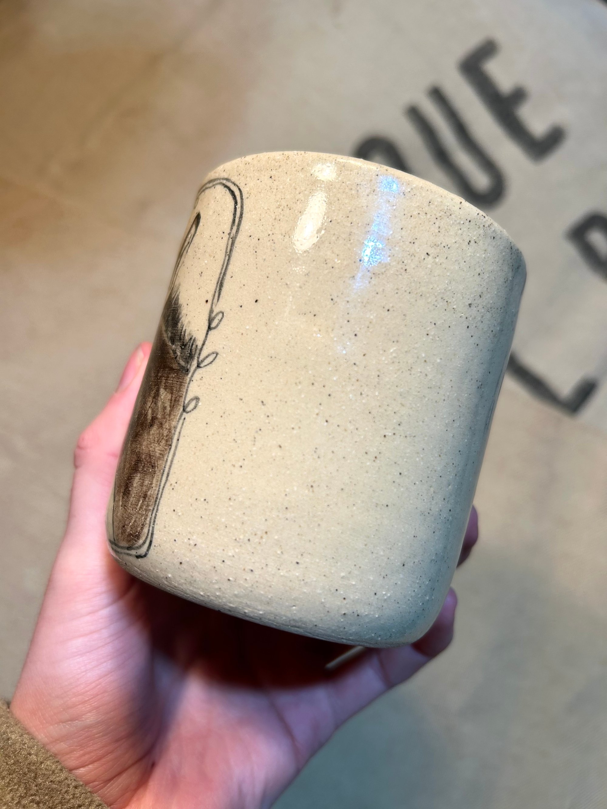 Handmade ceramic mug with hand-painted donkey head and squiggly border.