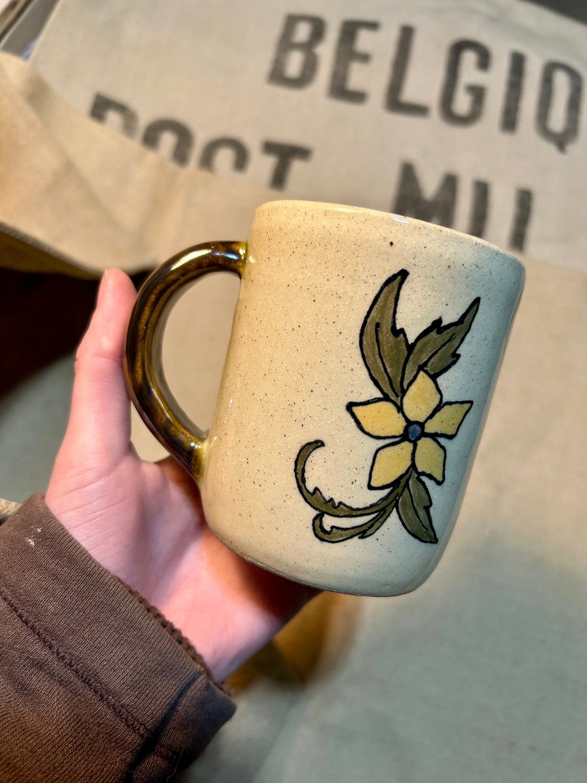 This mug may be slightly textured in some spots. The interior and handle glaze is a greenish-brown, the exterior has a clear glaze. Colors may appear slightly different in person.