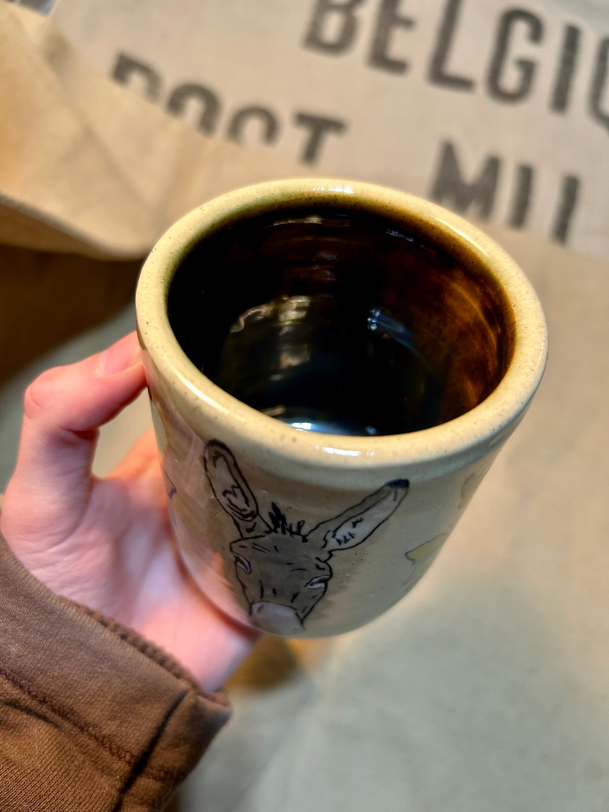Handmade ceramic mug with a hand painted donkey head and flowers.