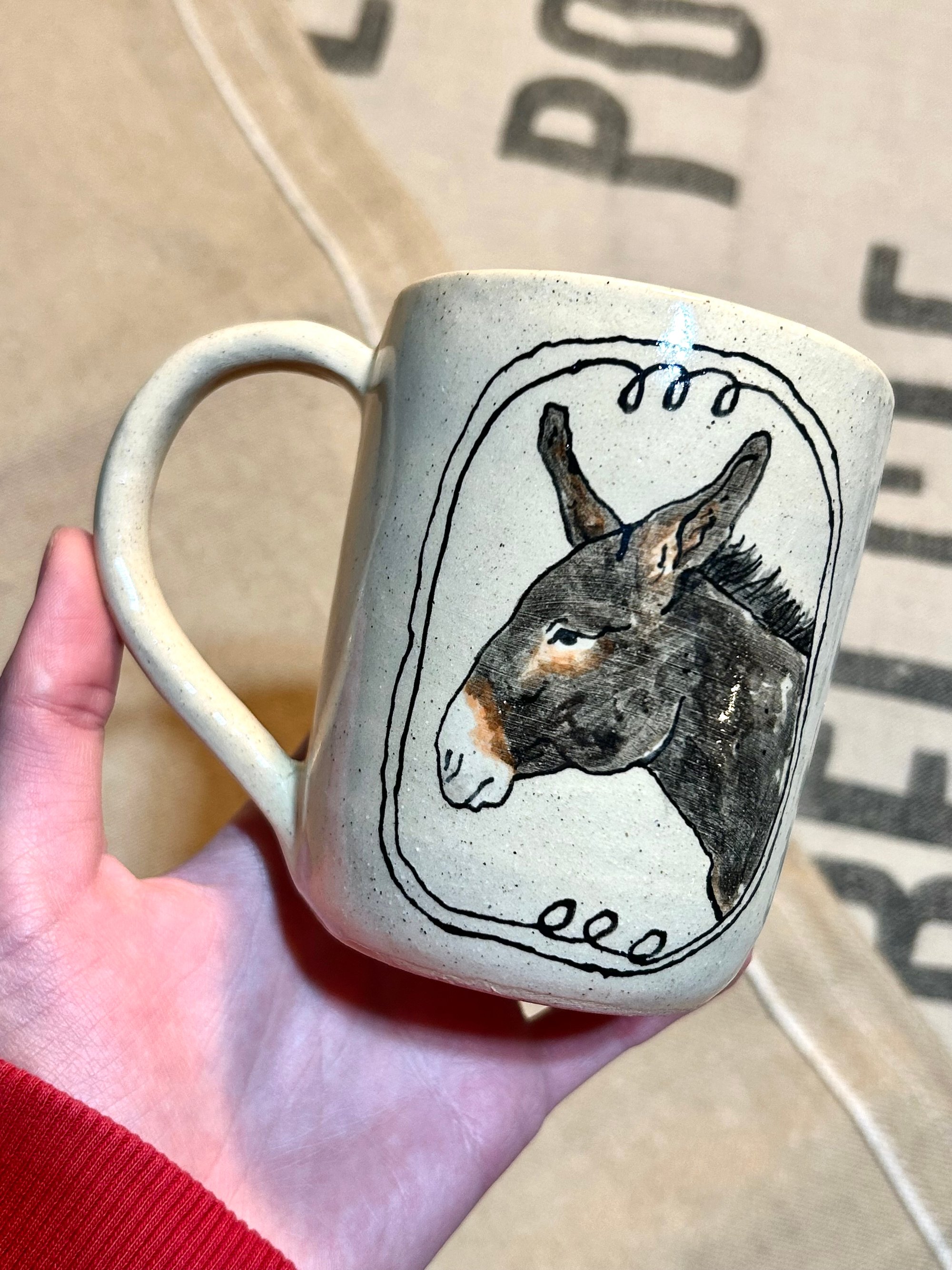 Handmade ceramic mug with hand-painted donkey head and squiggly border.