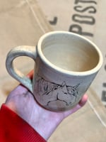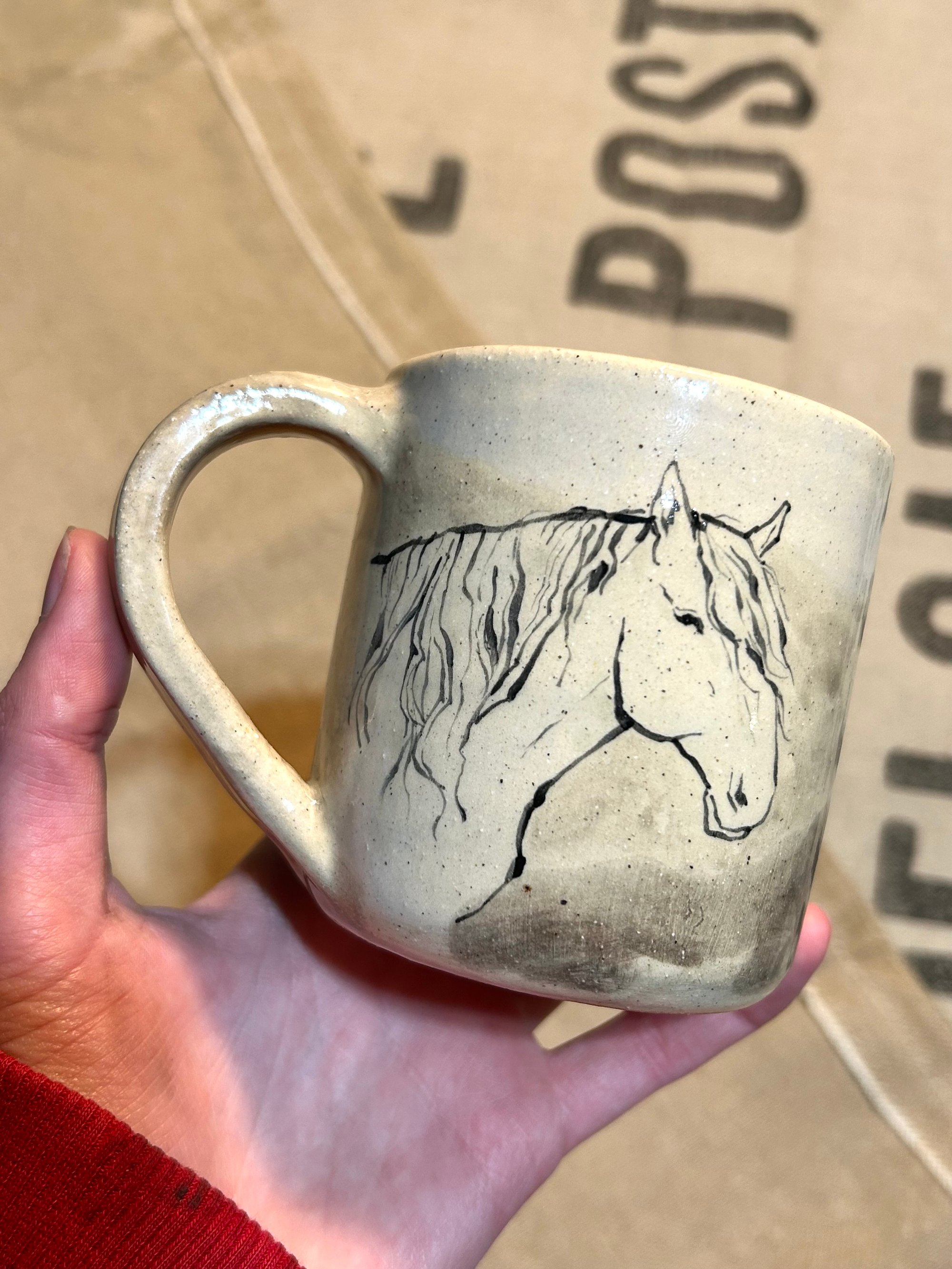 Handmade (wheel-thrown) ceramic mug with a hand-painted mustang stud and subtle mountain background. Has a pinhole on the glaze in the center of the mug (can be seen on the last photo), so price reflects that.