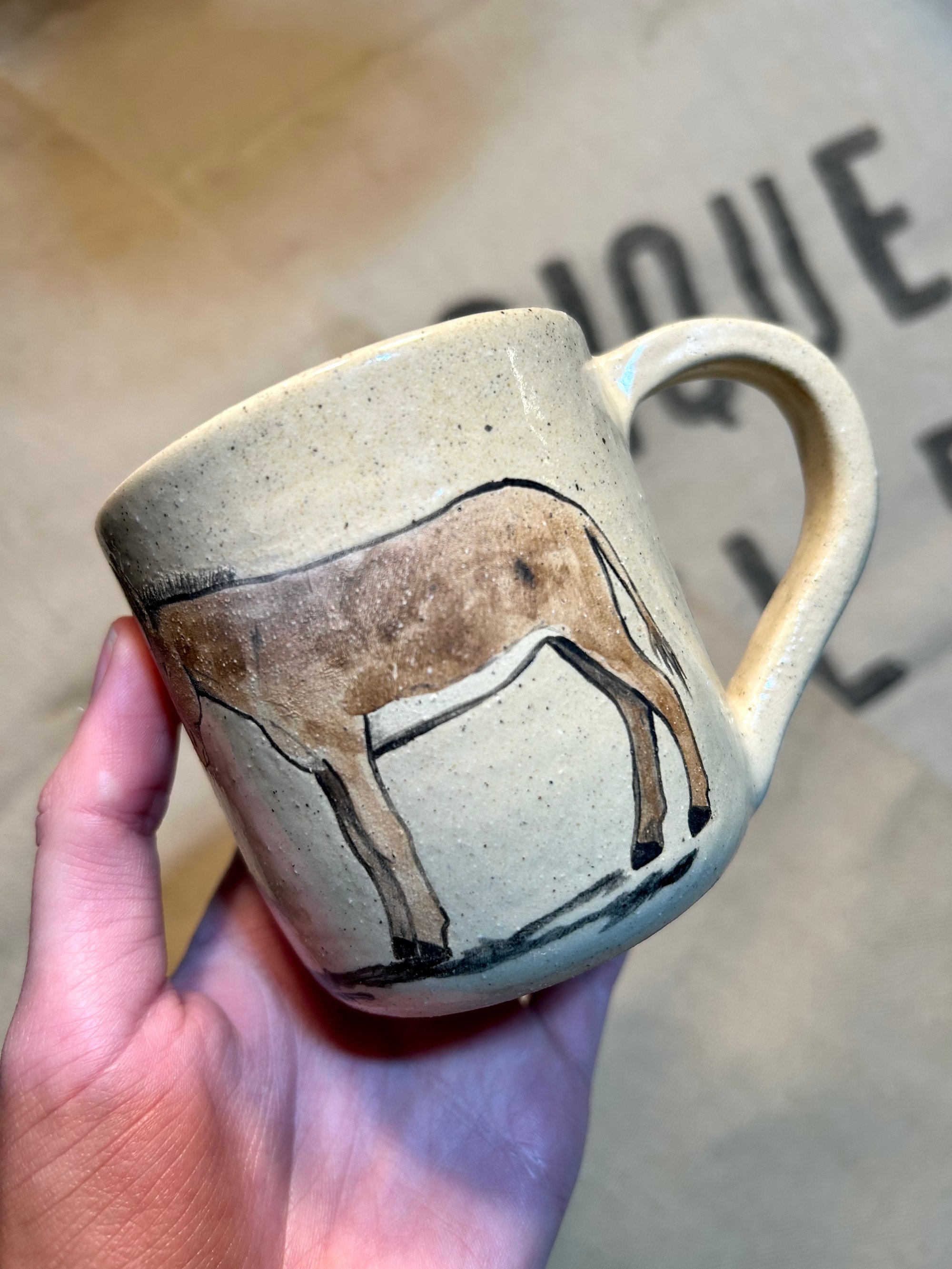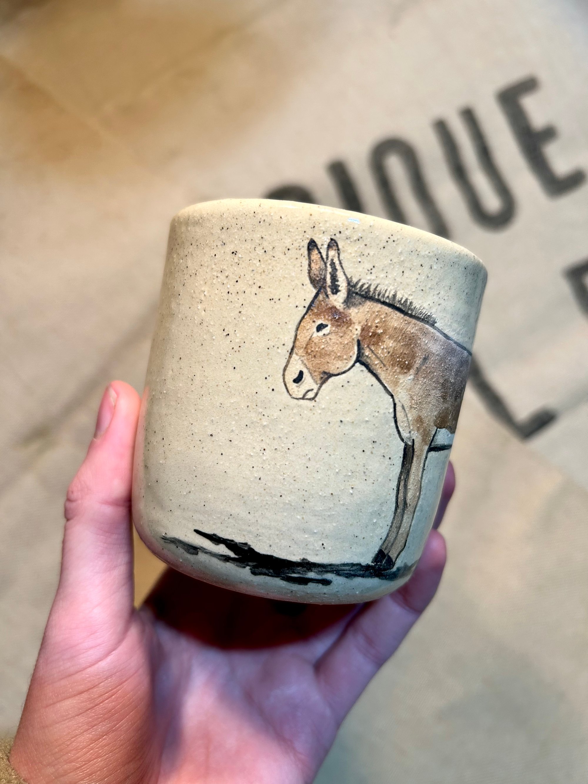 Handmade ceramic mug with hand-painted mammoth donkey. The interior glaze is brown with "melted" tan textures.