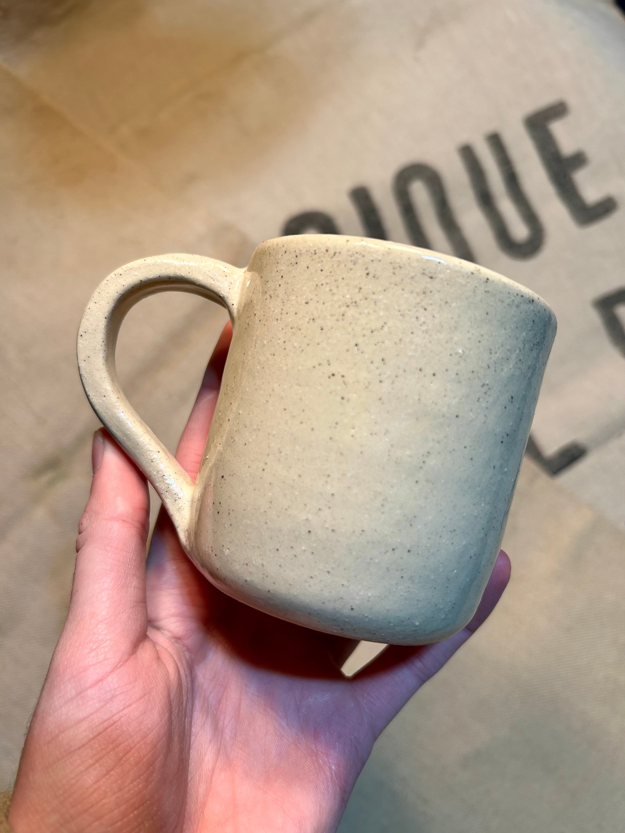 This mug was made with a buff colored stoneware clay body. There is some very slight texture. Mug colors may appear slightly different in person.