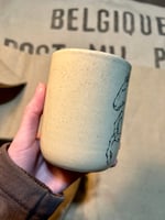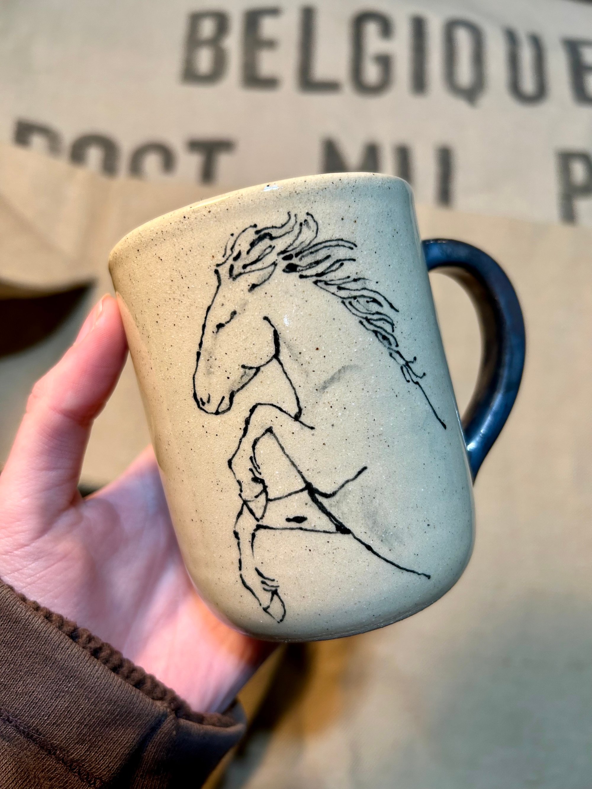 Handmade ceramic mug with a hand drawn horse rearing up.
