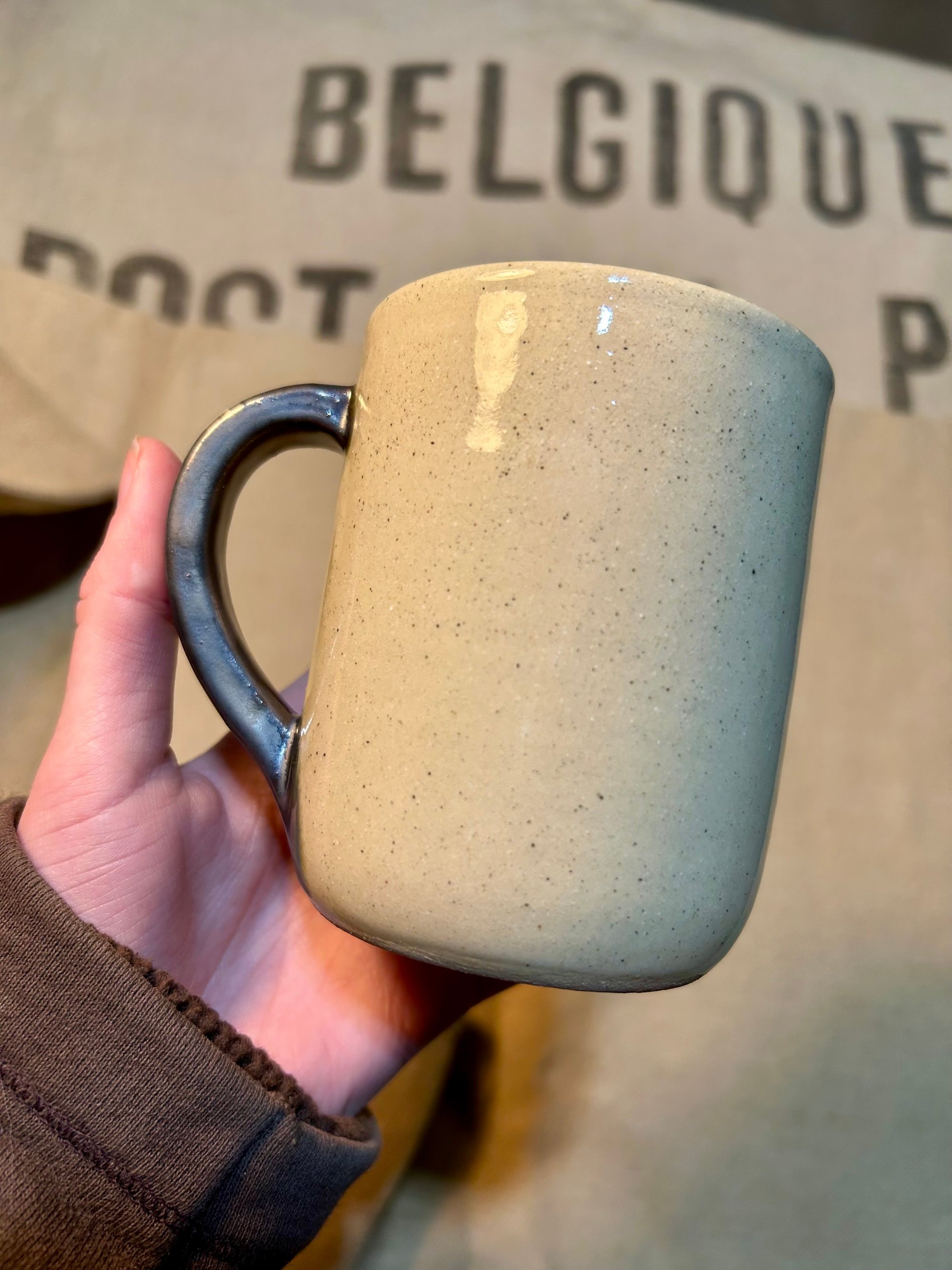 This mug may be slightly textured in some spots. The interior and handle is a new dark glaze that sort of resembles an oil spill. It is mostly a matte texture. The exterior has a clear glaze. Colors may appear slightly different in person.