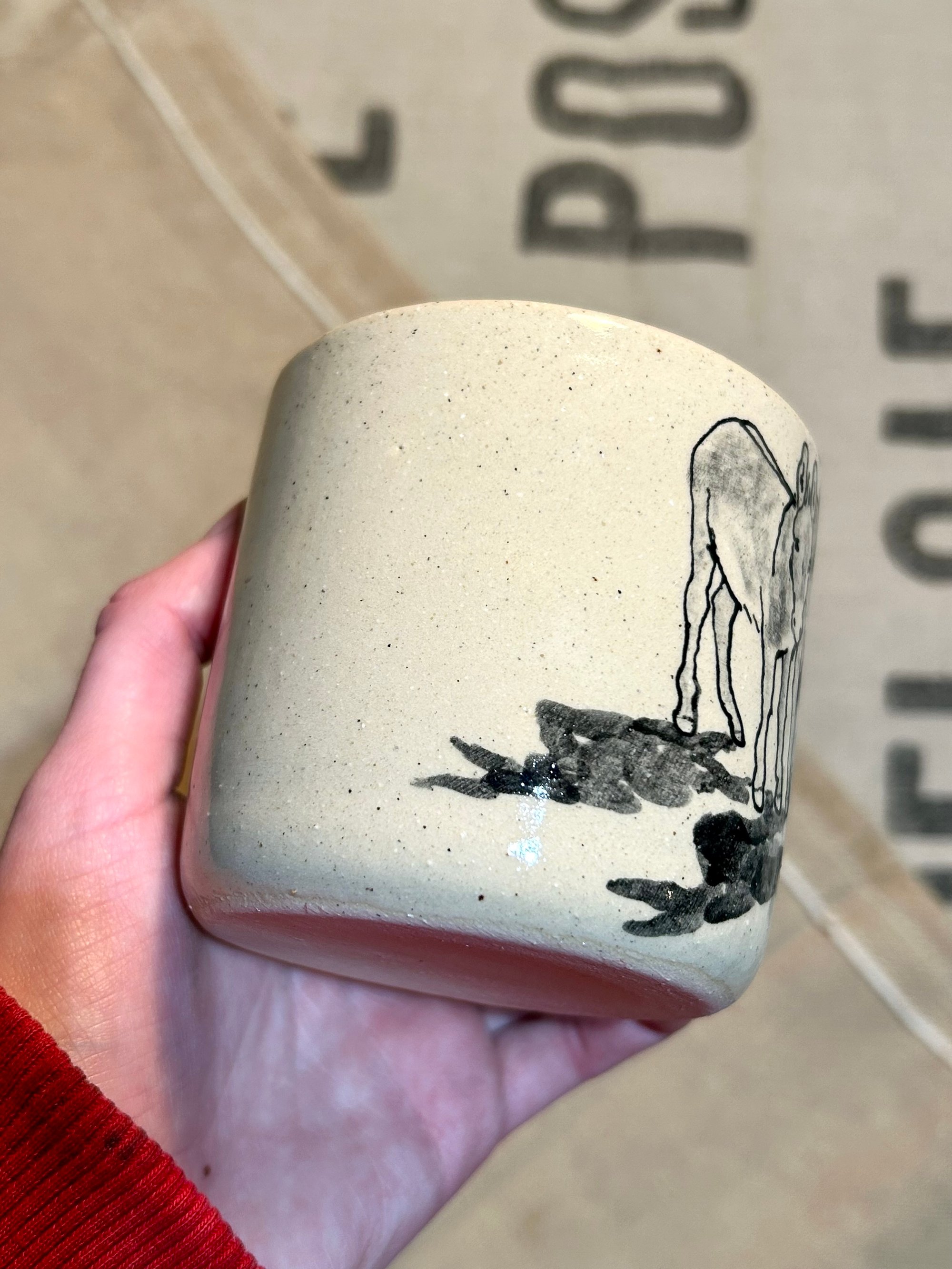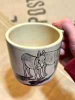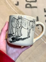 Handmade (wheel-thrown) ceramic mug, with a hand-painted pair of donkeys and their shadows.